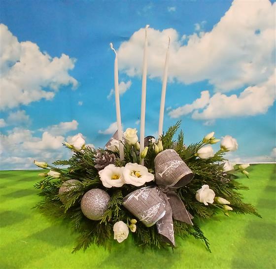 Winter Chill is a stunning flower and foliage Candle Table Arrangement. It has been decorated with white candles and white lisianthus, finished with festive baubles, cones and a colour co-ordinated bow.